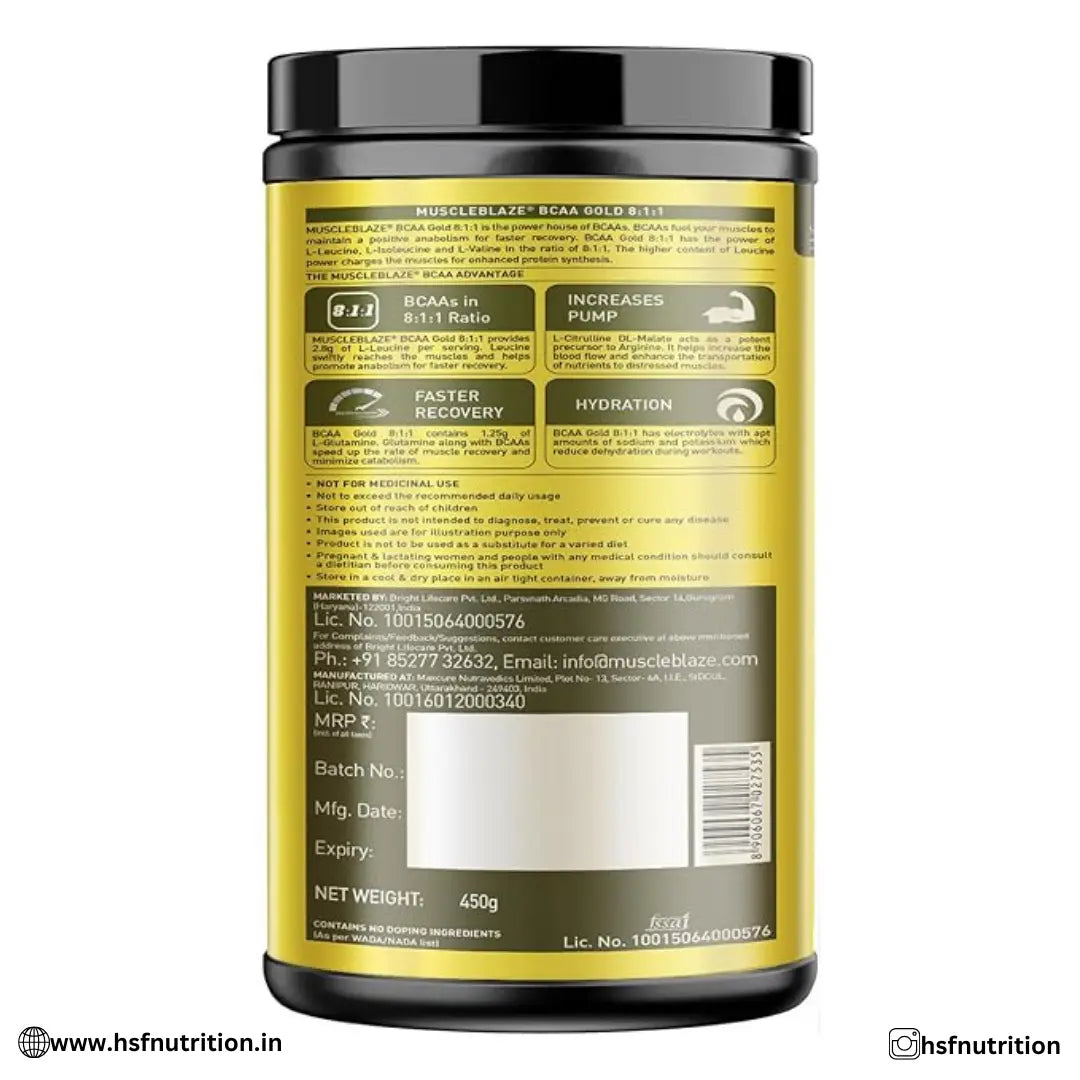 ✅MuscleBlaze BCAA Gold 8:1:1 Powder (Green Apple, 450g, 30 Servings) Fuel your body with the ultimate intra-workout supplement designed for serious athletes and fitness enthusiasts. MuscleBlaze BCAA Gold offers a premium 8:1:1 ratio of Leucine, Isoleucine, and Valine—far superior to the standard 2:1:1 found in most BCAA supplements. This potent blend of Branched-Chain Amino Acids (BCAAs) helps optimize muscle recovery, prevent catabolism, and enhance overall workout performance.