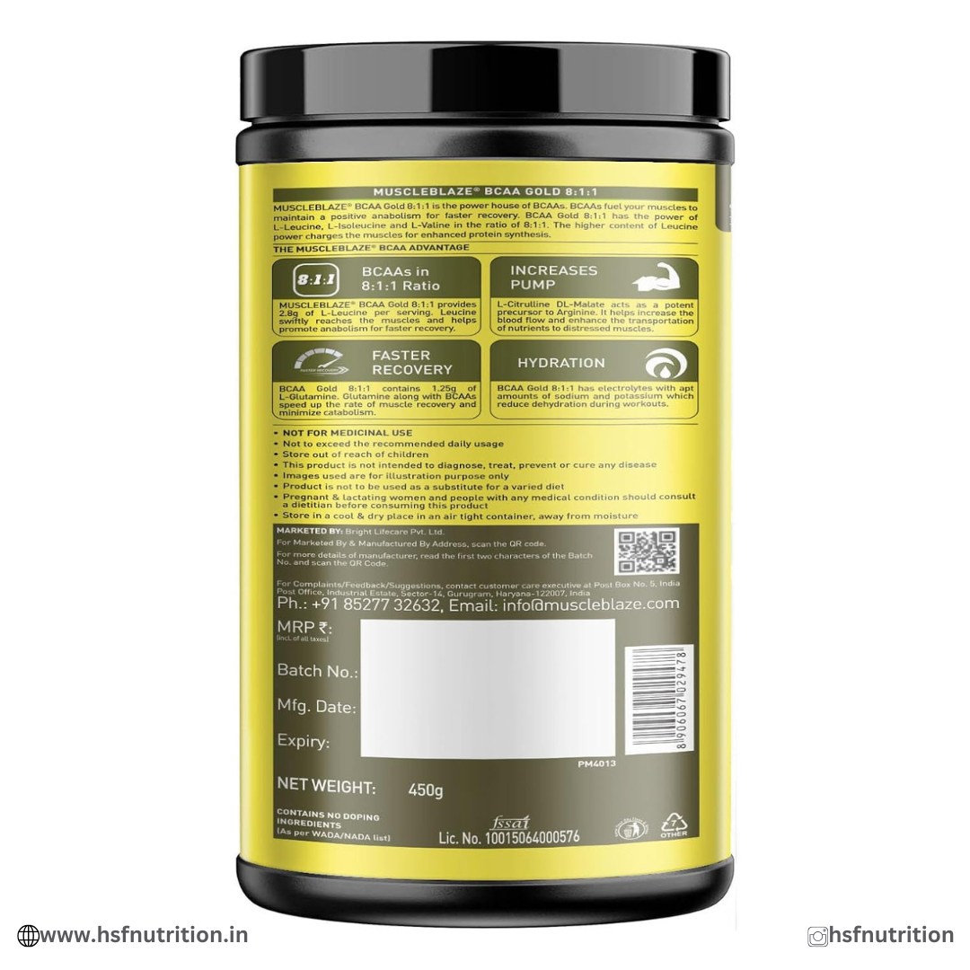✅Upgrade your workout performance with MuscleBlaze BCAA Gold 8:1:1, an advanced intra-workout supplement formulated with a high-leucine 8:1:1 BCAA ratio, L-Glutamine, and Electrolytes to support endurance, hydration, and faster muscle recovery.