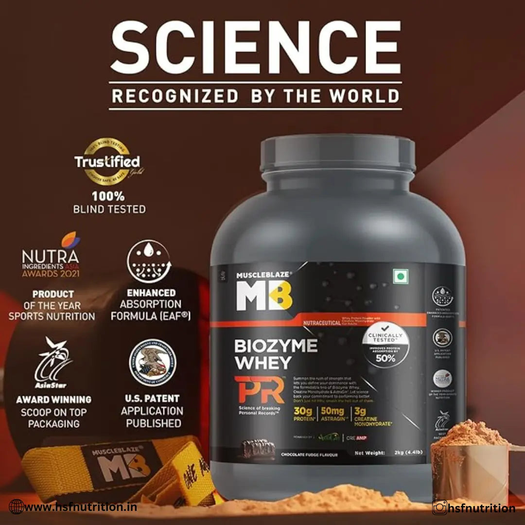 Muscleblaze MB Biozyme Whey Protein PR -  2Kg / 4.4Lbs, 30gm | 3G Creatine Monohydrate, 50Mg Astragin, Chocolate Fudge - Hold Strong Fitness & Nutrition