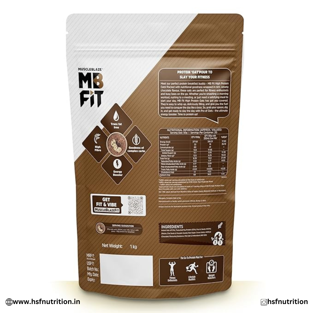 SKU: MB-Oats-1Kg Category: Protein Foods Tags: breakfast cereals, chocolate oats, dark chocolate oats, fiber rich oats, fitness oats, gym diet oats, healthy breakfast oats, healthy oats, high protein oats, HSF Nutrition, mb fit oats, muscleblaze oats, oats for muscle gain, oats for weight loss, protein breakfast, protein oats, super seeds oats Brand: MuscleBlaze