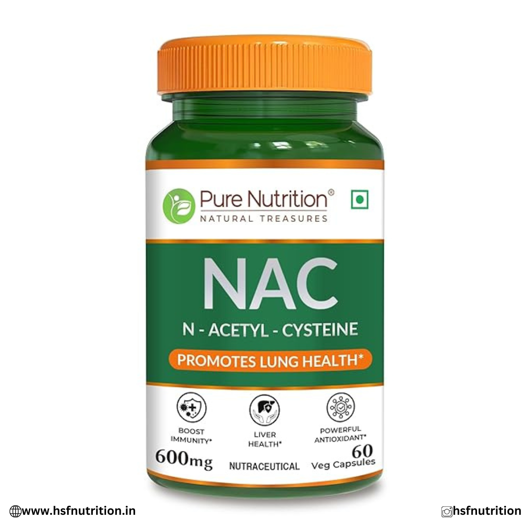 ✅Pure Nutrition NAC 600 mg – N-Acetyl L-Cysteine (60 Veg Capsules) Pure Nutrition NAC (N-Acetyl L-Cysteine) 600 mg is a high-quality nutraceutical supplement known for its powerful antioxidant properties. NAC helps increase glutathione levels in the body, which plays a vital role in detoxification, lung health, immunity, and cellular protection.